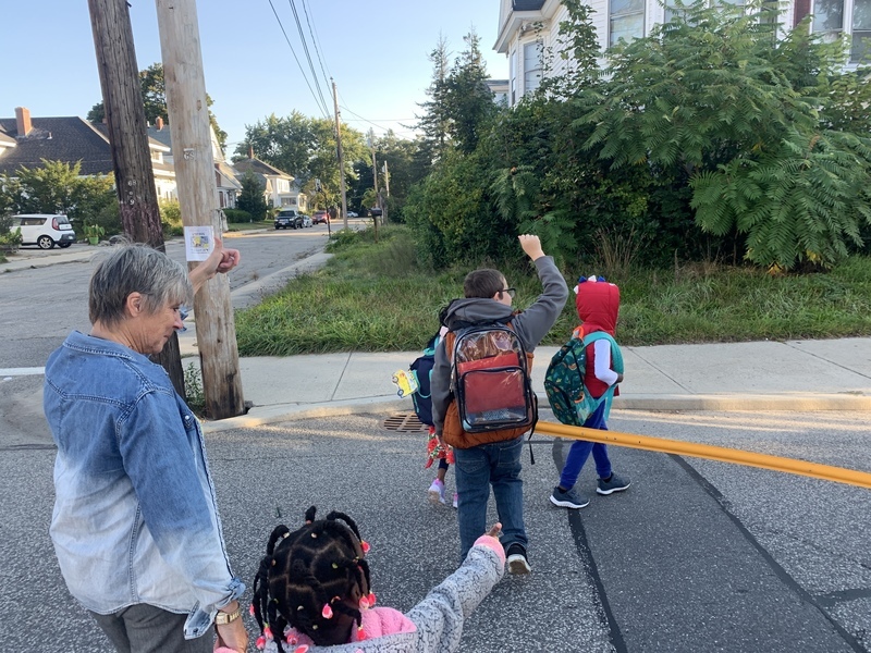 The volunteers meet in the CVS parking lot on Main Street, approximately a half mile from the school, at 7:35 a.m. They begin their route walking opposite the school, taking a right onto Charles Street, then a left on State Street Court. During their route, they pick up students from their homes and make their way to the bus stop. The students are excited to be walking with familiar faces of students and volunteers from the school.