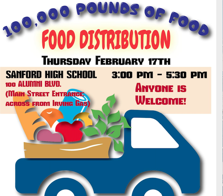 The Sanford Backpack Program will hold a FREE food distribution open to all this Thursday, February 17th, 2022 from 3:00-5:30 pm at Sanford High School.