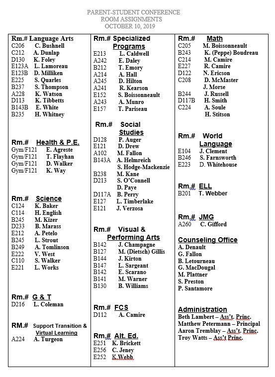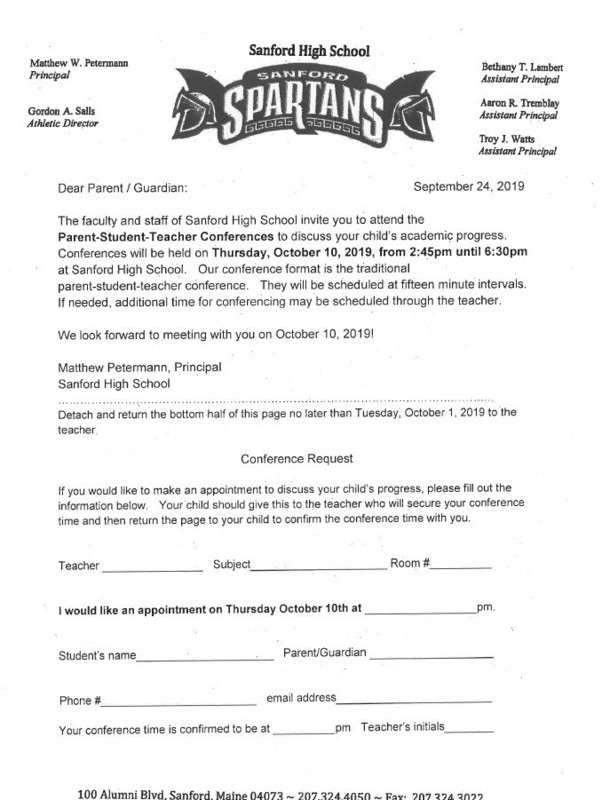 Sanford High School's Conferences are on October 10th and they run from 2:45pm to 6:30pm. Your student should have or will be bringing home Conference forms from their teachers. I will attach photos of the forms along with teacher locations on that evening. Please reach out to your student's teachers if you do not have the form and want a conference. Thank you and see you on the 10th!
