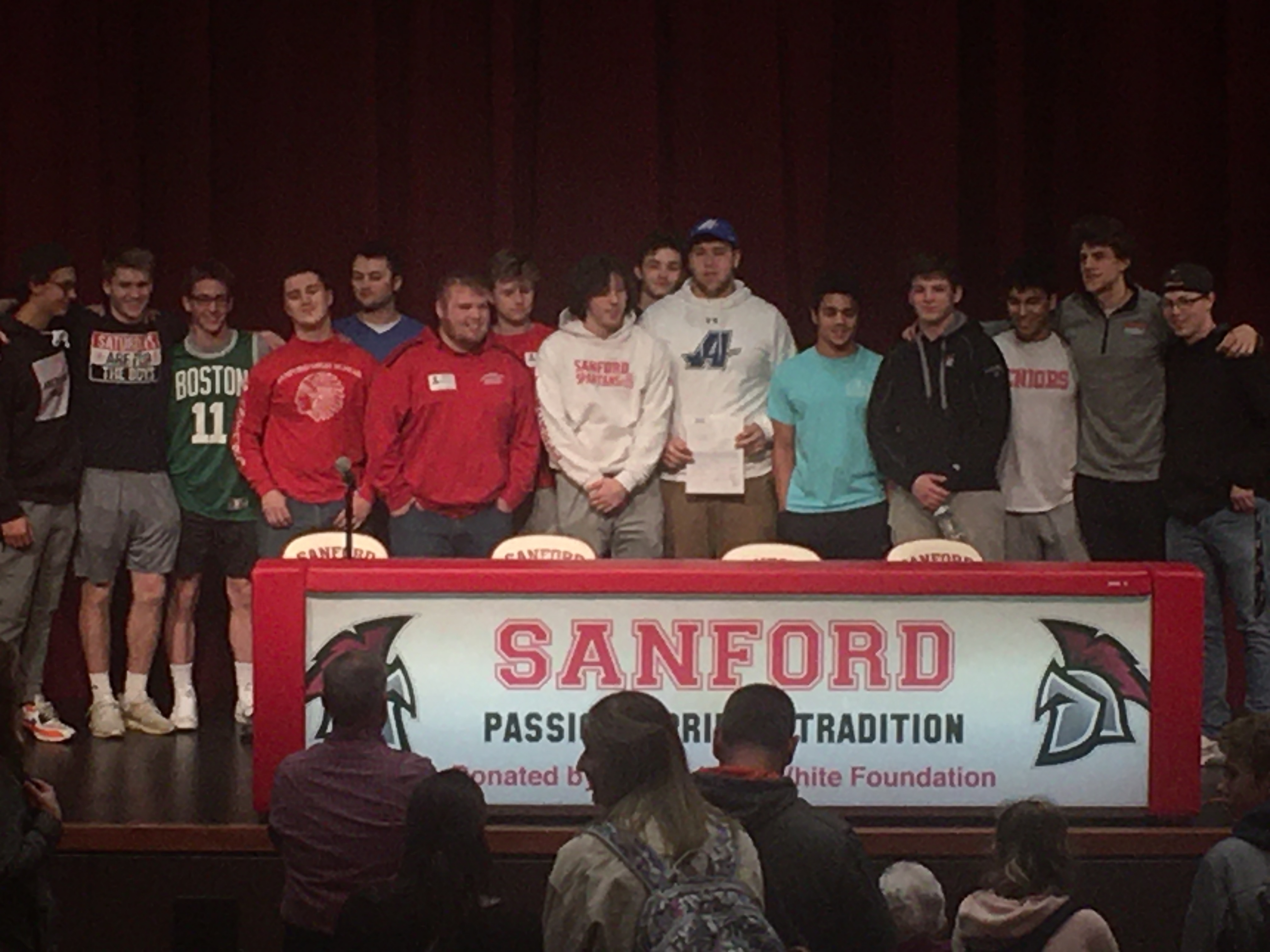 Spartan Senior Reese Boucher signed a National Letter of Intent to attend college and play football at Assumption College this afternoon in the Sanford Performing Arts Center. Friends and family were in the audience to congratulate him.