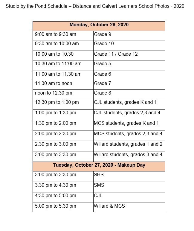 Please find the schedule from Studio by the Pond for 2020 School Photos for our Distance and Calvert Learners. This is not a make up day for those attending in person.